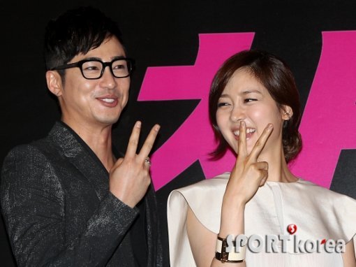 배우 강지환, 성유리(오른쪽)가 22일 오후 서울 왕십리 CGV에서 열린 ‘차형사’(감독 신태라) 시사회에 참석해 깜찍한 포즈를 취하고 있다.