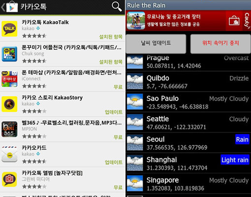 인기 앱의 배경 화면을 바꿔주거나 특정 기능을 이용할 수 있도록 돕는 ‘테마앱’이 화제다. ‘카카오톡’으로 검색하면 나오는 다양한 ‘테마앱’(왼쪽)과 인기 소셜 네트워킹 게임 ‘룰 더 스카이’에서 사용자의 위치를 속여주는 앱. 사진출처|구글 플레이