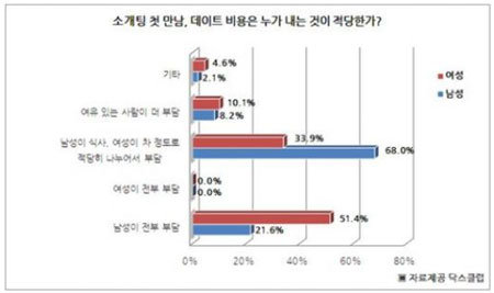 자료를 접한 누리꾼들은 “여자나 남자나 비슷하게 버는데 왜 남자만 다 부담하는거냐”, “여자들이 염치가 없다”라는 반응과 “소개팅은 한 번 보고 말수도 있는데 남성이 다 부담하는게 맞다”라는 반응으로 견해 차이를 드러냈다.
