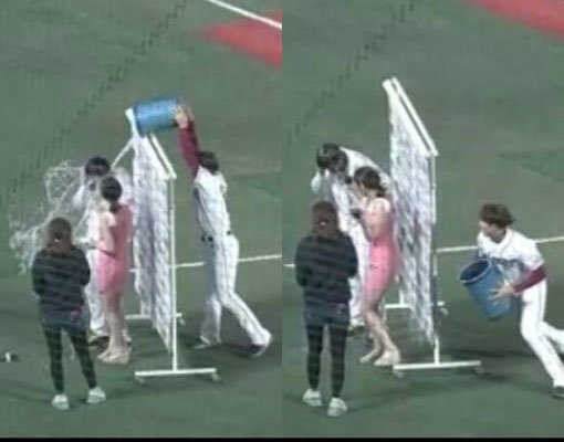 사진에서 분홍색 원피스 차림으로 인터뷰 중이던 공 아나운서는 판넬 너머에서 양동이로 물을 퍼부은 장효훈에 의해 물벼락을 맞고 있다. 장효훈의 개구진 몸놀림과 공 아나운서의 움츠린 모습이 대조적이다.