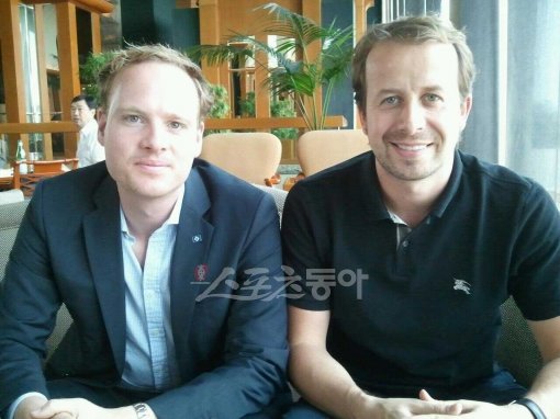 함부르크의 니콜라스 맥고완 국제마케팅 이사(왼쪽)와 손흥민의 에이전트 티스 블리마이스터가 25일 서울 시내 한 호텔에서 스포츠동아와 인터뷰하고 있다. 남장현 기자