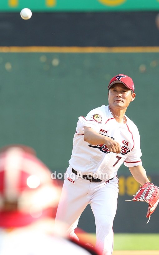 ‘바람의 아들’ 이종범이 26일 오후 광주 무등경기장 야구장에서 열린 프로야구 LG 트윈스와 KIA 타이거즈의 경기 전에 시구를 하고 있다. 시타는 아들 이정후. 올해 데뷔 20주년을 맞은 이종범은 지난 3월31일 시즌 개막을 1주일 앞두고 전격 은퇴를 선언했다.