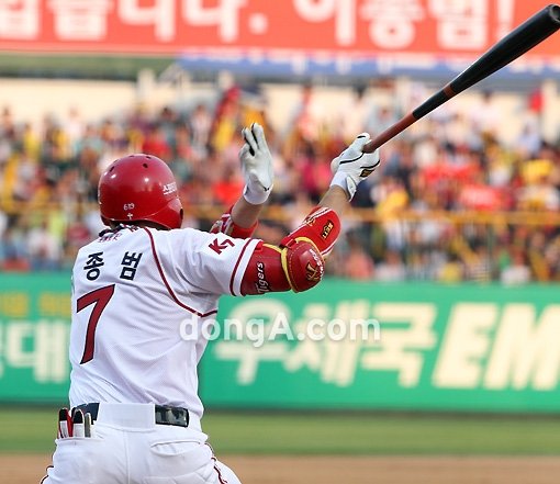 26일 오후 광주 무등경기장 야구장에서 열린 프로야구 LG 트윈스와 KIA 타이거즈의 경기에서 5회말 KIA 공격, 1사 1,3루 KIA 김원섭이 역전 1타점 적시타를 날리고 있다.