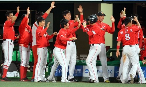 역전승이 더 짜릿한 법. SK 최정(앞줄 오른쪽 2번째)이 30일 목동 넥센전 9회 2사 1·3루서 박재홍의 적시 2루타로 홈을 밟은 뒤 덕아웃에서 동료들의 격한 환영을 받고 있다. 최정은 앞서 역전 우중간적시타를 치고 출루했다. 목동ㅣ박화용 기자 inphoto@donga.com 트위터 @seven7sola