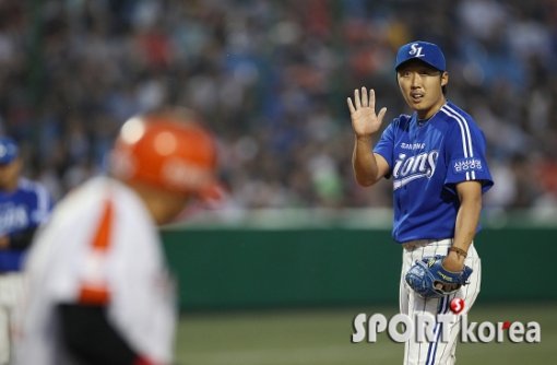 삼성 선발 배영수가 4회말 1사 2루에서 한화 4번 김태균의 몸에 볼을 맞춘 후 사과를 하고 있다.