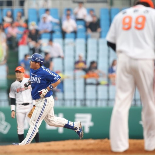 “얼마나 기다린 홈런인가….” 31일 1군에 복귀한 삼성 최형우(왼쪽)가 대전 한화전에서 2회 ‘괴물투수’ 류현진을 상대로 시즌 첫 홈런을 뽑은 뒤 그라운드를 돌고 있다. 35경기 만에 터진 홈런포다. 사진제공|스포츠코리아