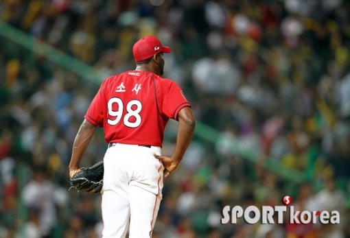 1일 오후 인천 문학구장에서 열린 `2012 팔도 프로야구` SK 와이번즈와 KIA 타이거즈의 경기에서 KIA 소사가 6회말에 SK 1번타자 정근우에게 솔로홈런을 맞고 타구가 넘어간 곳을 바라보고 있다. 소사는 이 전까지 2안타 무실점의 호투를 펼치고 있었다.