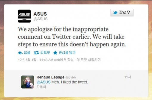 문제가 커지자 에이수스는 해당 트윗을 삭제하고 발빠르게 뒷수습에 나섰다. 다음 날인 4일에는 “부적절한 발언에 대해 사과드린다”며 “다시는 이런 일이 일어나지 않도록 하겠다”는 사과문을 올렸다. ‘이 정도는 문제 되지 않겠지’라는 생각으로 멘션을 남겼다가 혼쭐이 난 것. 에이수스는 이번 일로 소중한 교훈을 얻은 셈이다.