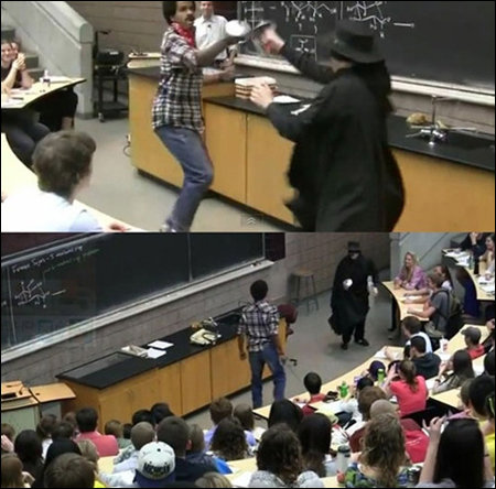 2분 분량의 이 동영상을 보면 수업이 한창인 한 대학의 강의실에 빨간 복면을 한 흑인 남자가 칼을 들고 난입한다.