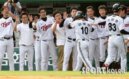 1회말 2사 만루에서 LG 7번 김태완이 만루 홈런을 친 뒤 더그아웃에서 선수들과 하이파이브를 하고 있다.