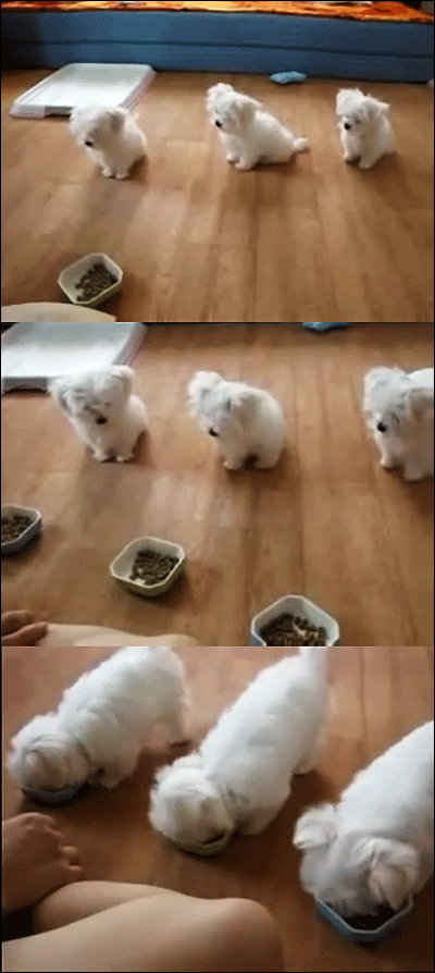 공개된 영상을 보면 강아지 세 마리가 사료 그릇 앞에 나란히 앉아 있다. 이 강아지들은 주인의 허락이 떨어지기 전까지 안절부절하며 기다리다가 “먹어”라는 신호가 떨어지자 재빠르게 밥그릇 앞으로 달려가 식사를 한다.