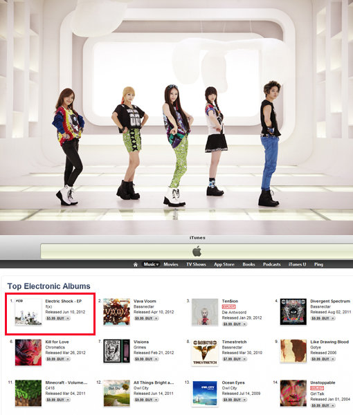 에프엑스는 새 미니앨범 ‘Electric Shock(일렉트릭 쇼크)’로 미국과 캐나다 아이튠즈 일렉트로닉 앨범 차트에서 1위에 올랐다.