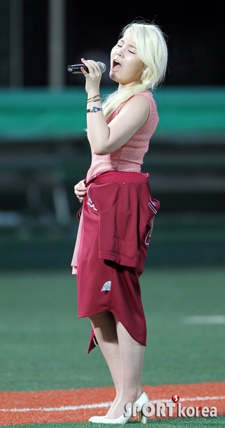 12일 오후 서울 목동구장에서 열린 `2012 팔도 프로야구` 넥센 히어로즈와 KIA 타이거즈의 경기 하프타임 때 가수 알리가 그라운드에서 공연을 펼치고 있다.