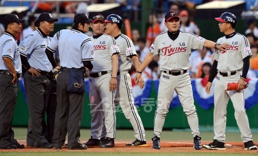 19일 대전 한밭야구장에서 열린 2012 프로야구 8위 한화이글스 대 2위 LG트윈스 경기 5회초 무사 2루 LG 이병규가 보내기 번트를 시도한 후 1루까지 전력 질주했으나 아웃 판정되자 김인호 코치가 항의하다 퇴장당하고 있다. 대전|김종원기자 won@donga.com 트위터 @beanjjun