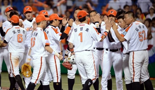 19일 대전 한밭야구장에서 열린 2012 프로야구 8위 한화이글스 대 2위 LG트윈스 경기에서 3-1 승리하며 2연승을 달린 한화 선수들이 경기 종료 후 하이파이브 하고 있다. 대전|김종원기자 won@donga.com 트위터 @beanjjun