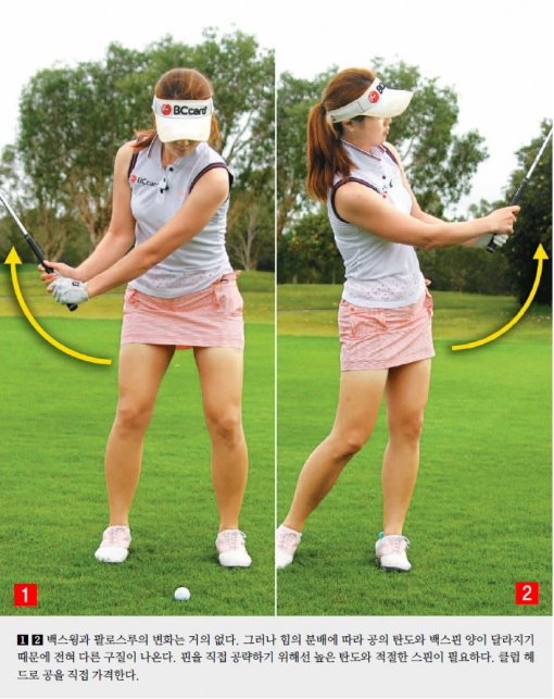 김하늘은 “어떤 방법을 사용해도 잘못된 방법은 아니다. 그러나 스핀양이 적은 골퍼가 스윙 크기를 이용해 거리를 조절할 경우 런(볼을 굴리는 일)이 많이 발생해 핀 주변에 공을 멈추지 못하는 현상이 나올 수도 있다. 조금 더 정확한 공략을 위해선 스윙의 크기를 일정하게 유지하면서 세기를 이용해 거리를 조절하는 방법이 효과적이다”고 말했다.