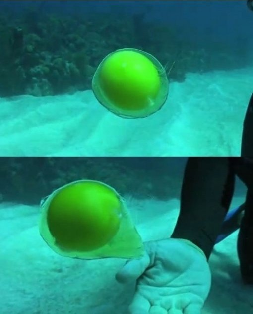 놀랍게도 한 잠수부가 계란을 깨자 수압 때문에 투명한 흰자가 노른자를 감싸 원형 그대로의 모습을 유지하고 있는 걸 볼 수 있다.