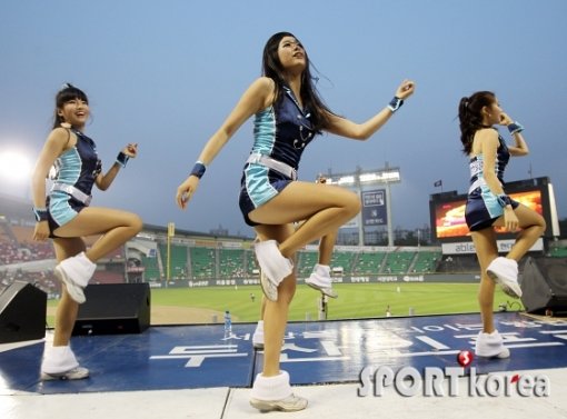 두산 치어리더들이 21일 오후 서울 잠실 야구장에서 `2012 팔도 프로야구` 두산 베어스와 넥센 히어로즈의 경기 중 이닝교체시간을 이용해 화려한 공연을 펼치고 있다.