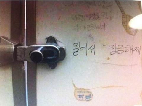 공개된 사진은 화장실의 문고리를 촬영한 것으로 ‘밀어서 잠금해제’라는 재치 넘치는 낙서가 웃음을 자아낸다.