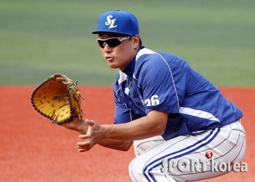 삼성 이승엽이 경기전 안지만 스타일로 모자를 쓰고 수비 훈련을 하고 있다.
