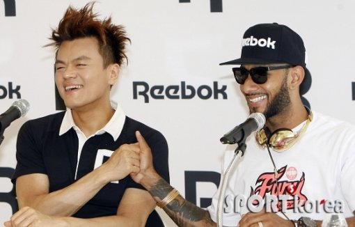 가수 겸 프로듀서 박진영과 프로듀서 겸 아티스트 스위즈 비츠(오른쪽)가 26일 오후 서울 강남 레스모아에서 열린 리복 2012년 하반기 새로운 `클래식 캠페인 콜라보레이션 런칭` 기자간담회에 참석해 인터뷰를 하고 있다.