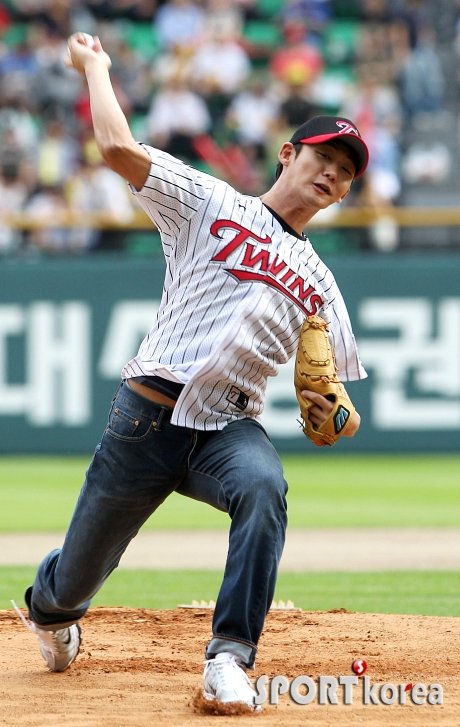 27일 오후 서울 잠실구장에서 열린 `2012 팔도 프로야구` LG 트윈스와 KIA 타이거즈의 경기에서 배우 이태성(27)이 시구하고 있다.