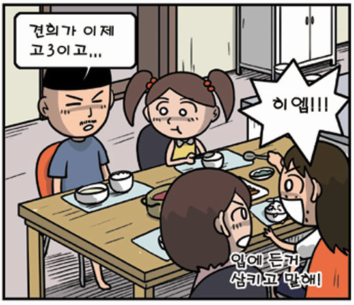 동화작가인 아빠(43), 전업주부 엄마(40), 천방지축 고3 수험생인 큰딸 견희와 꼼꼼하고 모범적인 초등학생 동생 묘희.