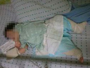 양쪽 다리를 온통 붕대로 감고 힘겹게 누워있는 아기의 모습과 허벅지 안쪽부터 생식기 주변까지 상처 부위가 벌겋게 부어오르고 짓물이 흐르고 있는 상태를 찍은 사진도 올라왔다.