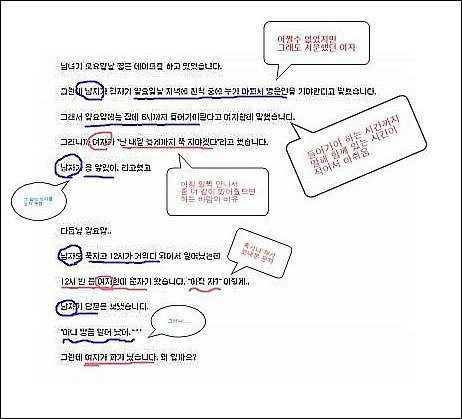 한 누리꾼이 친철하게 밑줄까지 쳐 가며 정리해 놓은 정답 풀이를 보면 ▲ 남자가 병문안 가는 걸 인정하지만 그래도 섭섭하다 ▲ ‘늦게까지 푹 자야겠다’는 여자의 말은 ‘아침 일찍 만나 좀 더 같이 있어줬으면 좋겠다’는 바람의 비유다 ▲ 6시까지 밖에 데이트를 하지 못하는 상황인데 남자가 정말로 늦잠을 잤다 ▲ 12시에 일어나고도 여자친구에게 먼저 연락하지 않은 점 등이다.