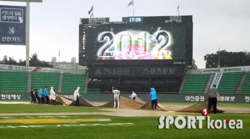 ‘2012 팔도 프로야구’ LG 트윈스와 삼성 라이온즈의 경기가 3일 오후 잠실 야구장에서 열린다. 갑작스레 내린 폭우에 구단 관계자들이 방수포를 덮고 있다.