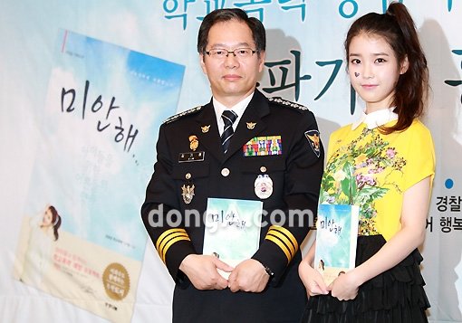 한편 이날 아이유는 학교폭력 공감서적 ‘미안해’의 출간기념회에서 팬 사인회를 열고 학교폭력의 실태와 예방의 방법에 대해 홍보활동을 펼쳤다. 학교폭력 공감서적 ‘미안해’는 홍용연 경감외에 경찰청 학교폭력 T/F팀 13명이 공동 저술에 참여했다. 인세 전액은 학교폭력 예방을 위한 기금으로 기부될 예정이다.