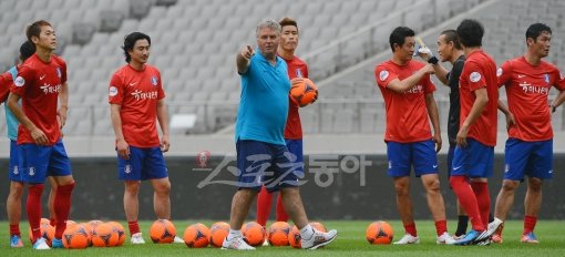 K리그 올스타전을 위해 10년 만에 다시 뭉친 2002한일월드컵 4강 전사들이 4일 서울월드컵경기장에서 훈련하고 있다. 히딩크 감독(가운데)이 지시를 하지만 귀담아 듣지는 않는 모습이다. 상암|박화용 기자 inphoto@donga.com 트위터 @seven7sola