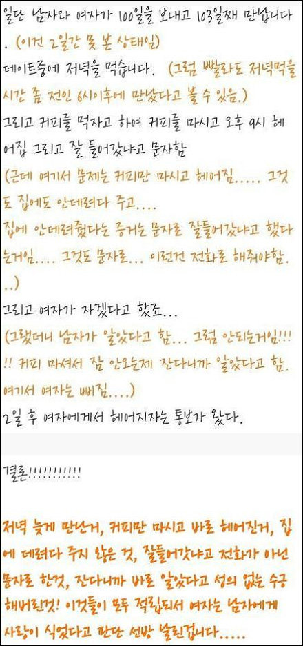 《남자와 여자가 100일이 되어 즐거운 시간을 보냈다. 남자와 여자 모두 만족스러웠고 즐겁게 헤어졌다. 103일째 되던 날 만나 데이트를 하고 역시 즐거웠다. 데이트를 하는 중 저녁식사를 하기로 했다. 여자가 카페에 들려 커피를 먹자고 하여 커피를 먹었다. 그 후 9시쯤에 헤어졌다. 집에와서 남자가 여자에게 잘 들어갔냐고 문자를 했다. 여자가 남자에게 그렇다고 했다. 그후 여자가 잠을 자겠다고 하기에 남자가 알았다고 했다. 2일후 여자에게서 헤어지자는 통보가 왔다. 왜 여자는 헤어지자고 했을까?》