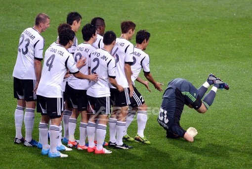 2002년 한일월드컵에서 4강 신화를 일궈낸 태극전사들의'팀 2002' 대 K리그 팬투표로 선정된 스타들로 구성된 '팀 2012'의 '2002 월드컵대표팀 초청 하나은행 K리그 2012 올스타전'이 5일 서울월드컵경기장에서 열렸다. 전반전 TEAM 2012 에닝요가 선제골을 넣고 골키퍼 김영광를 이용해해 볼링 세리머니를 하고 있다.
