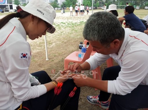 최현주는 “통증 때문에 때로는 테이핑을 하고 활을 쏘기도 한다”고 밝혔다. 박 코치는 샌드페이퍼로 정성스럽게 제자의 손을 문질러 굳은살을 다듬었다. 이는 양궁선수들이 가장 많이 애용하는 손 관리법이다. 손이 건조하면 갈라지기 쉽기 때문에, 자기 전에 핸드크림을 바르는 선수도 있다. 여자선수들은 ‘예쁜 손’이 로망일 법도 하지만, 일종의 직업병으로 웃어넘기는 경우가 대부분이다.