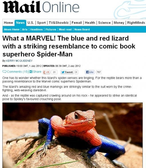 영국의 데일리메일은 1일(현지시간) ‘만화영웅 스파이더맨과 매우 흡사한 파란색과 빨간색의 도마뱀’이라는 제목과 함께 사진 한 장을 크게 보도했다. 이른바 스파이더 도마뱀이다. 사진 속 도마뱀의 포즈와 색깔이 스파이더맨과 아주 닮아 감탄사가 절로 나올 정도. 누리꾼들은 뉴스를 접한 뒤 ‘스파이더맨과 싱크로율 100%’라고 부르고 있다.