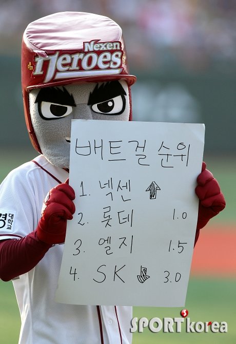 ‘2012 팔도 프로야구’ 넥센 히어로즈와 KIA 타이거즈의 경기가 8일 오후 목동 야구장에서 열렸다. 넥센 마스코트 턱돌이가 배트걸의 순위를 들어 보이고 있다.