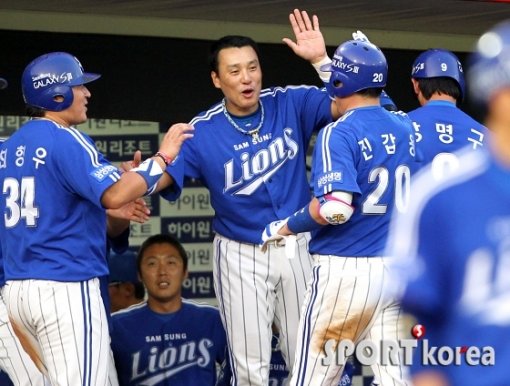 8일 오후 부산 사직구장에서 열린 `2012 팔도 프로야구` 롯데 자이언츠와 삼성 라이온즈의 경기 삼성 8회초 무사 2,3루에서 2타점 적시타를 친 뒤 2루까지 뛰다가 아웃된 진갑용이 덕아웃으로 들어가며 이승엽의 환영을 받고 있다.