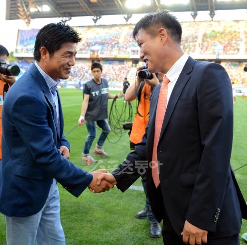 8일 저녁 수원월드컵경기장에서 열린 프로축구 2012 K리그 수원 삼성과 경남FC의 경기에서 수원 윤성효 감독(왼족)과 경남FC 최진한 감독이 인사를 하고 있다.
