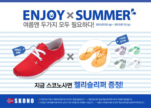 15일까지 직영 온라인 쇼핑몰(www.skonokorea.com)을 비롯 스코노 제품을 판매하는 온라인몰에서 5만원 이상 제품을 구매한 고객에게 바캉스 필수 아이템인 젤리 슬리퍼 600개를 선착순으로 무료로 증정한다.