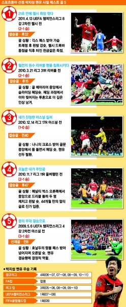 박지성은 2월6일 첼시 원정에서 후반 39분 교체 투입돼 맨유 200경기 출전의 금자탑을 쌓았다. 2005년 8월 데브레첸(헝가리)과 유럽축구연맹(UEFA) 챔피언스리그 3차 예선에서 공식 데뷔전을 치른 후 3년4개월 만인 2008년 12월 토트넘 전에서 100경기 출전, 다시 3년2개월 만에 200경기에 출전했다. 박지성의 성공을 단적으로 보여주는 예다.
