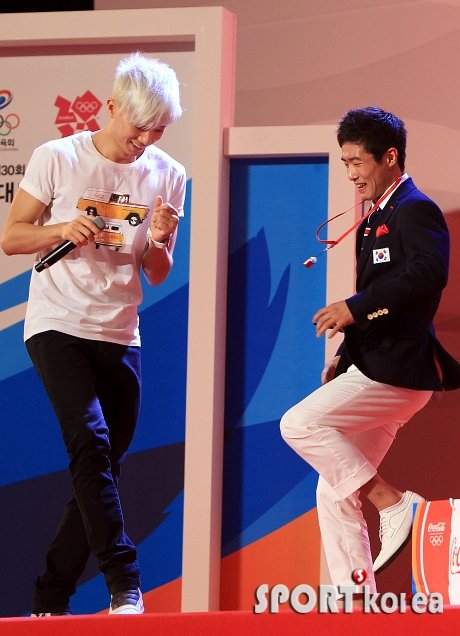 체조국가대표 양학선(오른쪽)이 11일 오후 서울 송파구 방이동 올림픽 홀에서 열린 `제3회 런던올림픽 대한민국 대표 선수단 결단식`에 참석해 2PM 우영과 함께 셔플댄스를 선보이고 있다.