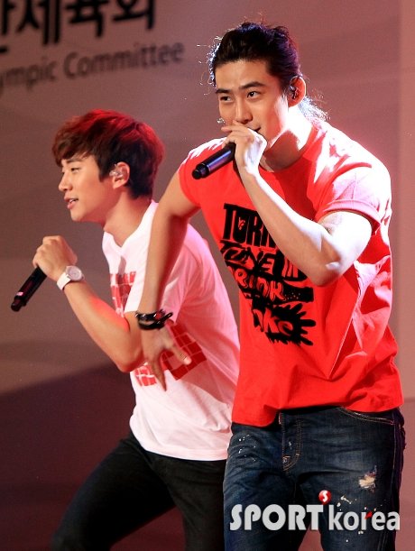 11일 오후 서울 송파구 방이동 올림픽 홀에서 열린 `제3회 런던올림픽 대한민국 대표 선수단 결단식`에 참석한 2PM 준호, 택연(오른쪽)이 멋진 응원을 펼치고 있다.