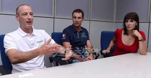 “무호흡의 쾌감은 경험하지 않으면 모른다.” 프랑스의 프리다이버 스타 크리스티앙 말다메가 프리다이빙의 매력에 대해 설명하고 있다. 크리스티앙 말다메, 에이메릭 알라드 프랑스국가대표팀 코치, 통역을 맡은 방송인 이다도시(왼쪽부터). 김종원 기자 won@donga.com 트위터 @beanjjun