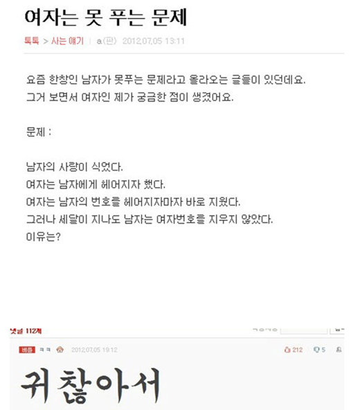 최근 한 온라인 커뮤니티 게시판에는 ‘여자는 못 푸는 문제’라는 제목의 게시물이 올라왔다.