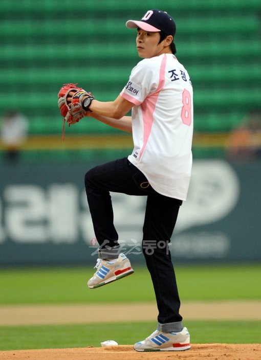 12일 저녁 서울 잠실야구장에서 열린 프로야구 두산과 한화의 경기에서 납득이 조정석이 시구를 하고 있다.
