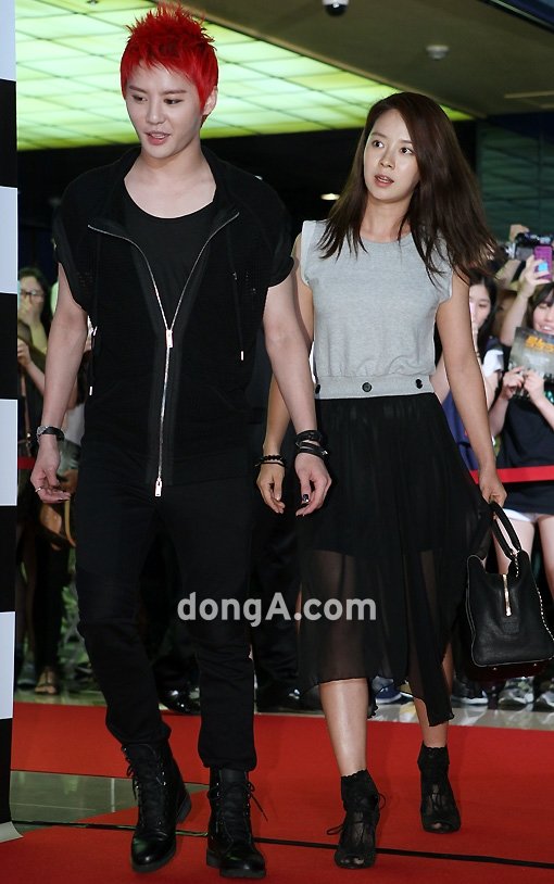 그룹 JYJ 김준수(왼쪽)와 송지효가 12일 오후 서울 강남구 메가박스 코엑스에서 열린 영화 ‘도둑들’ VIP시사회에 앞서 포토타임을 갖기 위해 포토월로 들어서고 있다.
