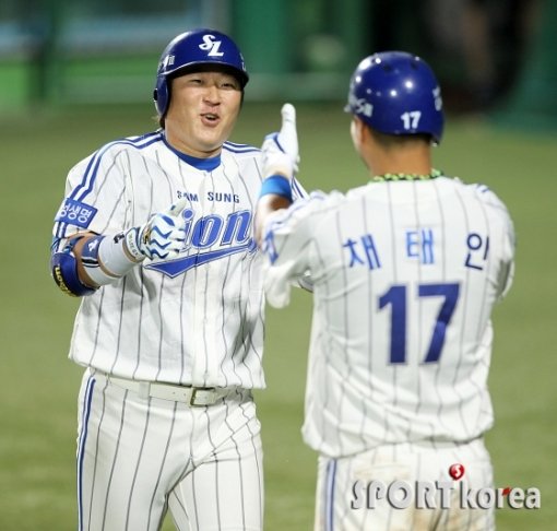 12일 오후 대구 시민구장에서 열린 `2012 팔도 프로야구` 삼성 라이온즈와 LG 트윈스의 경기에서 삼성 최형우가 7회말 2사 1,2루 때 스리런 홈런을 때리고 득점을 올린 뒤 채태인의 환영을 받고 있다.