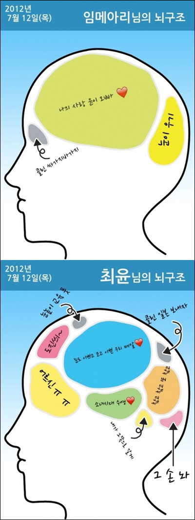 반면 최윤의 뇌구조는 꽤 복잡하다. ‘눈도 이쁘고 코도 이쁜 우리 메알’이 가장 큰 부분을 차지한 가운데 ‘소녀시대 수영’, ‘참고 참고 또 참고’, ‘그 손 놔’, ‘내가 그 쪽으로 갈게’, ‘어르신’, ‘도진씨’등으로 나뉘어져 있다.