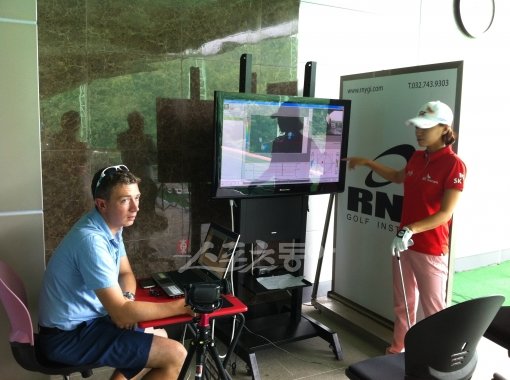 최나연(오른쪽)이 13일 경기도 안성의 신안골프장 내에 위치한 RNY골프인스티튜트에서 로빈 사임스 스윙코치와 함께 비디오를 보며 잘못된 자세에 대해 이야기를 나누고 있다. 안성|주영로 기자 na1872@donga.com 트위터 @na1872